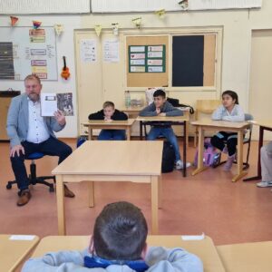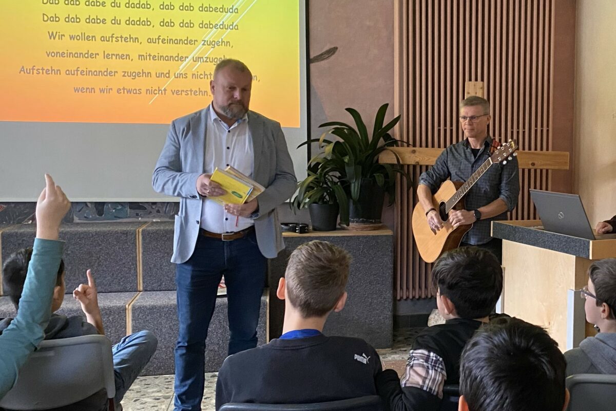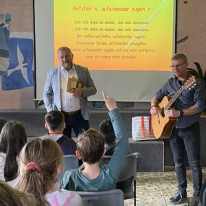 Landrat Thomas Eberth kam zum Vorlesetag an die Drei-Linden-Schule nach Sommerhausen. Die Schulgemeinschaft begrüßte ihn mit einem Lied und der Landrat wirkte mit dem Schellenkranz gleich selbst mit. Nach einer kurzen Vorstellung ging Herr Eberth mit in die Klasse 2/3/4. Dort forderte er die Schülerinnen und Schüler auf, den Kopf auf den Tisch zu legen und beschrieb ihnen einen Räuber. Auf diese Weise führte er die Klasse zur Geschichte vom Räuber Hotzenplotz, aus welcher er den Kindern eine ganze Weile vorlas.