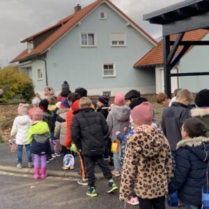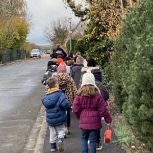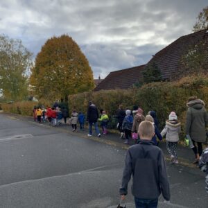 Die Route führte im Viereck durch die an das Schulhaus angrenzenden Straßen. An jeder Ecke wurde mit Begeisterung ein neues Laternenlied mit Gitarrenbegleitung gesungen. Am Schulhaus angekommen wurden auf Wunsch der Kinder natürlich alle Lieder noch einmal wiederholt und sie gingen uns wie Ohrwürmer den ganzen Tag nicht mehr aus dem Kopf.
