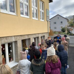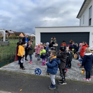 Am 10. November 2023 machten wir uns zum Laternenumzug auf. Die Kinder der beiden Gelchsheimer Schulklassen, begleitet von drei Lehrerinnen, versammelten sich voller Vorfreude auf dem Flur. Nachdem alle ihre selbstgebastelte Laterne in der Hand hielten und mit einem Teelicht zum Leuchten brachten, konnten wir endlich losmarschieren. Auf dem Pausenhof gesellte sich noch eine Vorschulgruppe der Maria-Stern-Schule mit ihren leuchtenden Laternen zu uns.