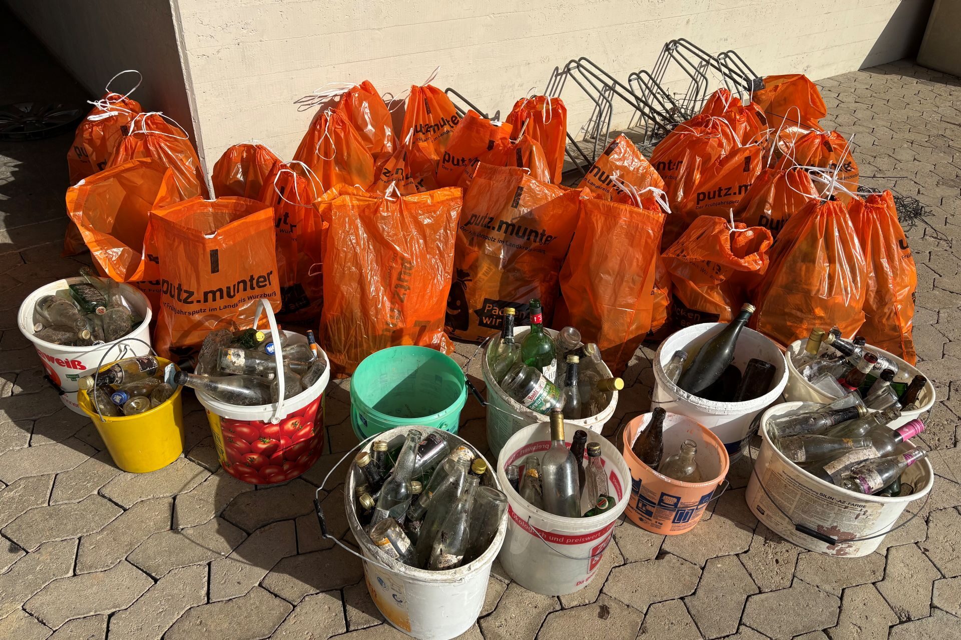 Voller Tatendrang starteten wir auch in diesem Jahr wieder zum Müllsammeln. Mit Tüten, Greifzangen und Handschuhen ausgestattet zogen wir durch die Straßen. Wir waren überrascht und entsetzt, wie viel Müll achtlos auf die Straßen, Gehwege oder in Hecken und Gebüsche geworfen wird. In diesem Jahr fanden wir besonders viele Flaschen. Die Anzahl der Kippen ging durch die neuen Aschenbecher an den Bushaltestellen zum Glück etwas zurück. Mit schweren Tüten und Eimern ging es dann wieder zurück zur Schule. Dort bekamen wir Wurst- und Käsebrötchen, die uns der Bürgermeister Jürgen Götz für unseren Einsatz spendiert hatte.
