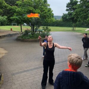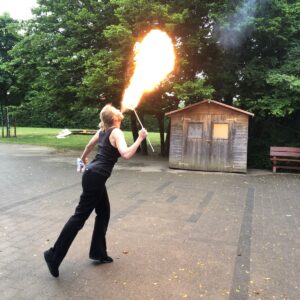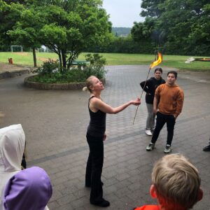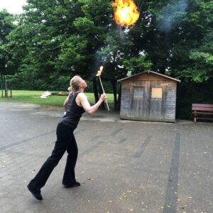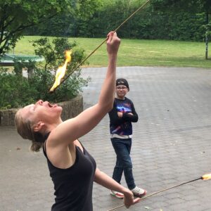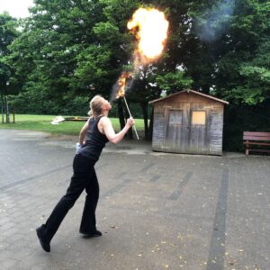 23.10.2025Die Klasse 4/5 beschäftigte sich in den vergangenen Wochen mit dem Thema Feuer und lernte viel über die Entdeckung des Feuers, den Nutzen, aber auch die Gefahren. Am letzten Donnerstag durften wir nun aus nächster Nähe erleben, wie Feuer geschluckt und gespuckt werden kann. Frau Doris Wagner besuchte uns und erklärte uns die Geheimnisse dieses gefährlichen Spiels mit dem Feuer. Nur wer einen intensiven Lehrgang absolviert, viel geübt und die nötigen, speziellen Materialien hat, kann und darf diese Kunststücke durchführen. Tief beeindruckt erlebten wir die Vorführung im Pausenhof. Ein sehr herzliches Dankeschön noch einmal für diesen interessanten Einblick!