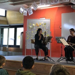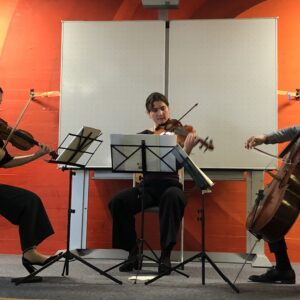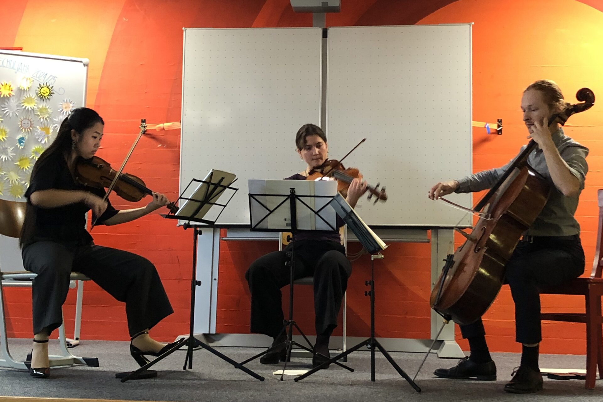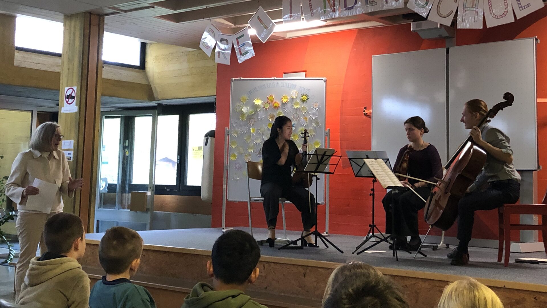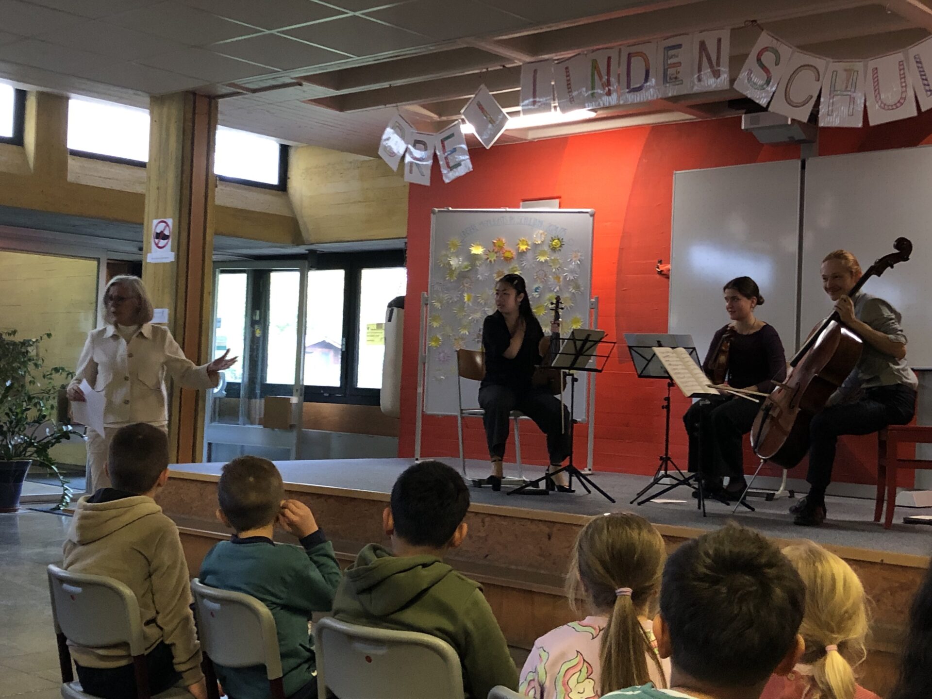 23.10.2025Am 13. Oktober verzauberte uns das Amadé Quartett – in Trio-Besetzung mit klassischer Musik. Zum Trio gehörten Kei Kashiwabara mit der Violine, Malina Sophie Rutt mit der Viola und Lucas Jansen mit dem Cell. Die zwei Musikerinnen und der Musiker werden von der Yehudi Menuhin live music now FRANKEN e.V. gefördert. Sie haben uns auf die „Suche nach der Romantik“ mitgenommen. Mit Musikstücken von Ludwig van Beethoven, Franz Schubert und Jean Sibelius wurde uns beim Zuhören bewusst, dass Romantik sehr unterschiedlich sein kann. Nach einer kurzweiligen Stunde waren viele Kinder der Meinung, dass klassische Musik auch toll sein kann.