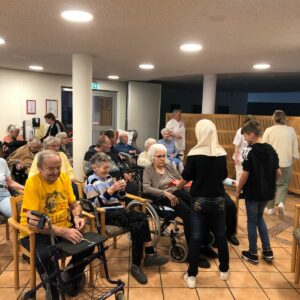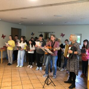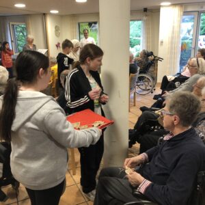 23.10.2025So lautet das Titellied des diesjährigen Aktionstages Musik, mit dem die Klassen 3/4 und 4/5 das gemeinsame Singen mit den Bewohnerinnen und Bewohnern des Seniorenwohnheimes Sankt Hedwig eröffneten. Weiter ging es mit vielen bekannten Frühlingsliedern (Vogelhochzeit, Alle Vögel sind schon da, Es tönen die Lieder, …), bei denen die Bewohnerinnen und Bewohner begeistert mitsangen. Die Kinder hatten vorher mit ihren Eltern oder Großeltern Interviews durchgeführt und erfragt, welche Lieder und zu welcher Gelegenheit sie als Kinder sangen und ein paar Kinder stellten ihren Fragebogen vor. Anschließend erzählten uns einige Bewohnerinnen von ihren früheren Lieblingsliedern. Sie erzählten auch, dass früher sehr viel zuhause gesungen wurde. Die Klasse 4/5 hatte hübsche Herzen getöpfert, die anschließend verteilt wurden. Die Bewohnerinnen und Bewohner freuten sich riesig und die Kinder bekamen Schokolade geschenkt. Wir freuen uns schon auf den nächsten Besuch!