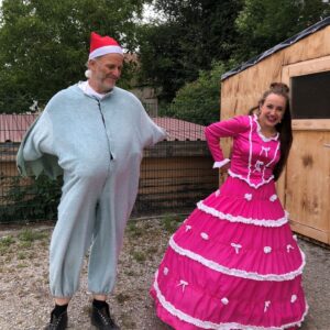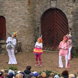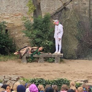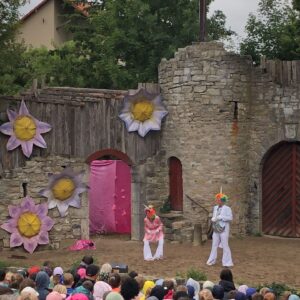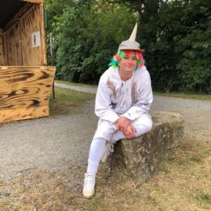 Bei Nieselregen machten sich die Klassen 1-6 in zwei Bussen auf den Weg nach Giebelstadt zu den Kinderfestspielen. Auf dem Programm stand das NEINhorn, nach dem gleichnamigen Buch von Marc-Uwe Kling und Astrid Henn. Kurz vor der Vorstellung regnete es kurz noch einmal richtig. Dann blieb es zum Glück trocken. Die Bänke wurden abgezogen und mit Folie bedeckt, so dass wir auf trockenen Bänken sitzen konnten. Dann begann auch schon das Stück. In fröhlichen Liedern, witzigen Reimen und Dialogen und originellen Kostümen erzählten die Schauspielerinnen und Schauspieler die Geschichte vom NEINhorn und seinen Freunden. Das Buch wurde so liebevoll und lustig umgesetzt, dass alle Altersklassen ihre Freude daran hatten.